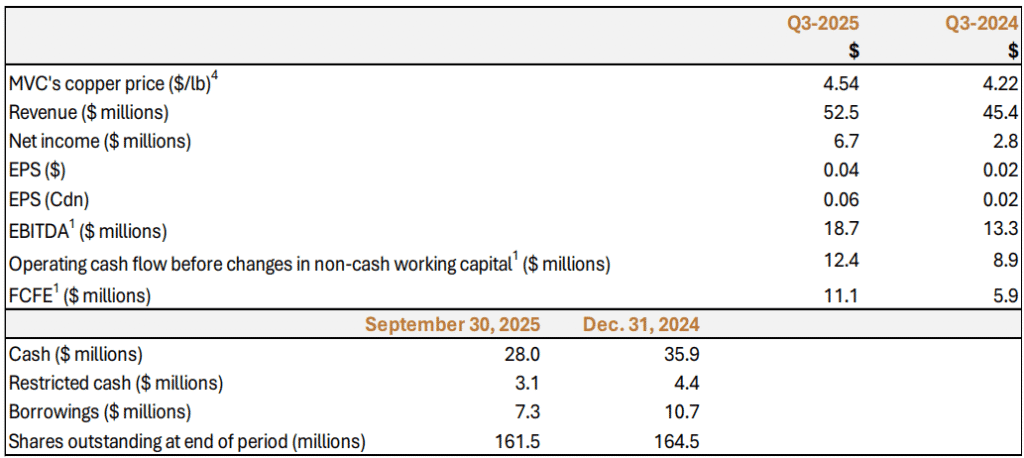 production from MVC of 14.6 million pounds (“M lbs”) (Q3-2024: 16.3 M lbs) at an average MVC copper