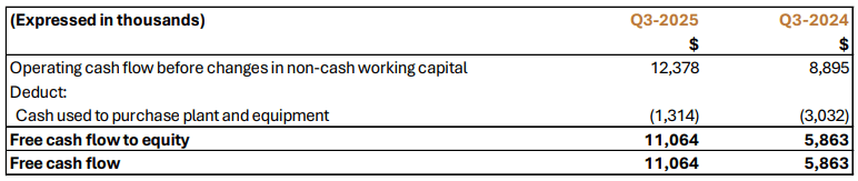 - Free cash flow to equity1 was $11.1 million in Q3-2025 (Q3-2024: $5.9 million), after capital expenditures