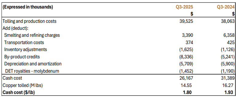 - Q3-2025 cash cost1 was $1.80/lb (Q3-2024: $1.93/lb). The $0.13/lb reduction in cash cost1 was caused