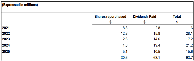 returned $93.7 million to shareholders to date. The Company’s quarterly dividend has now been increased to