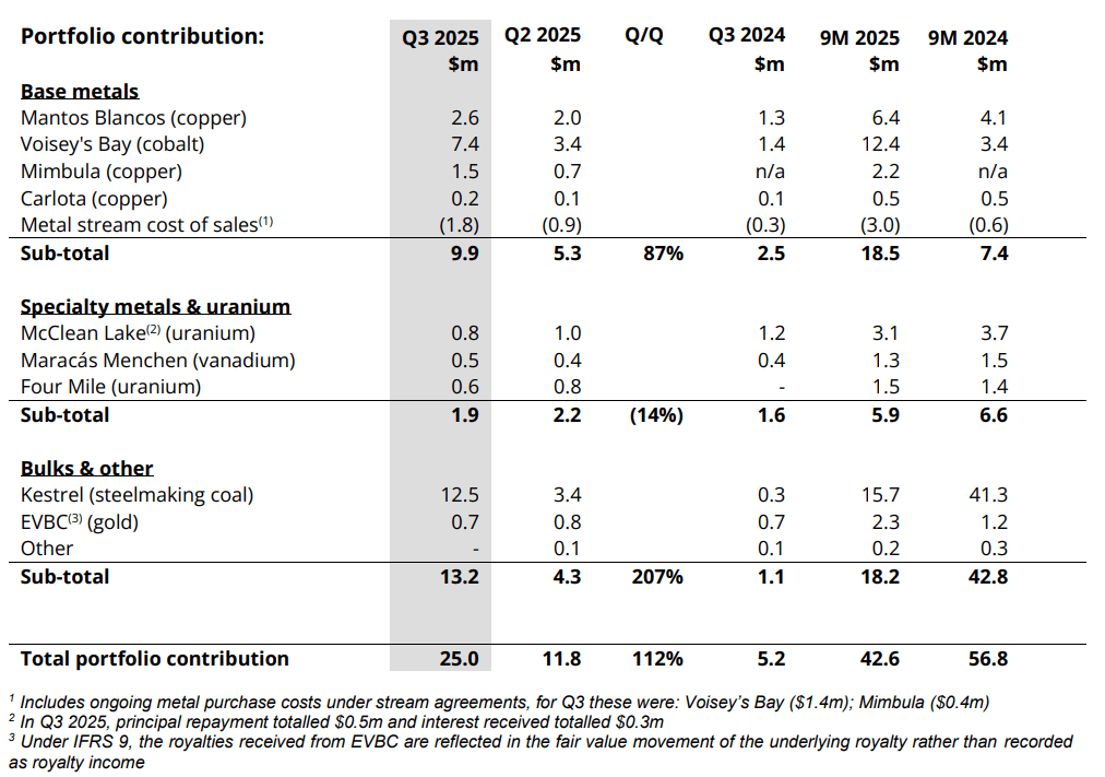 - $25.0 million total portfolio contribution for Q3 2025, up 112% on Q2 2025 ($11.8 million) driven