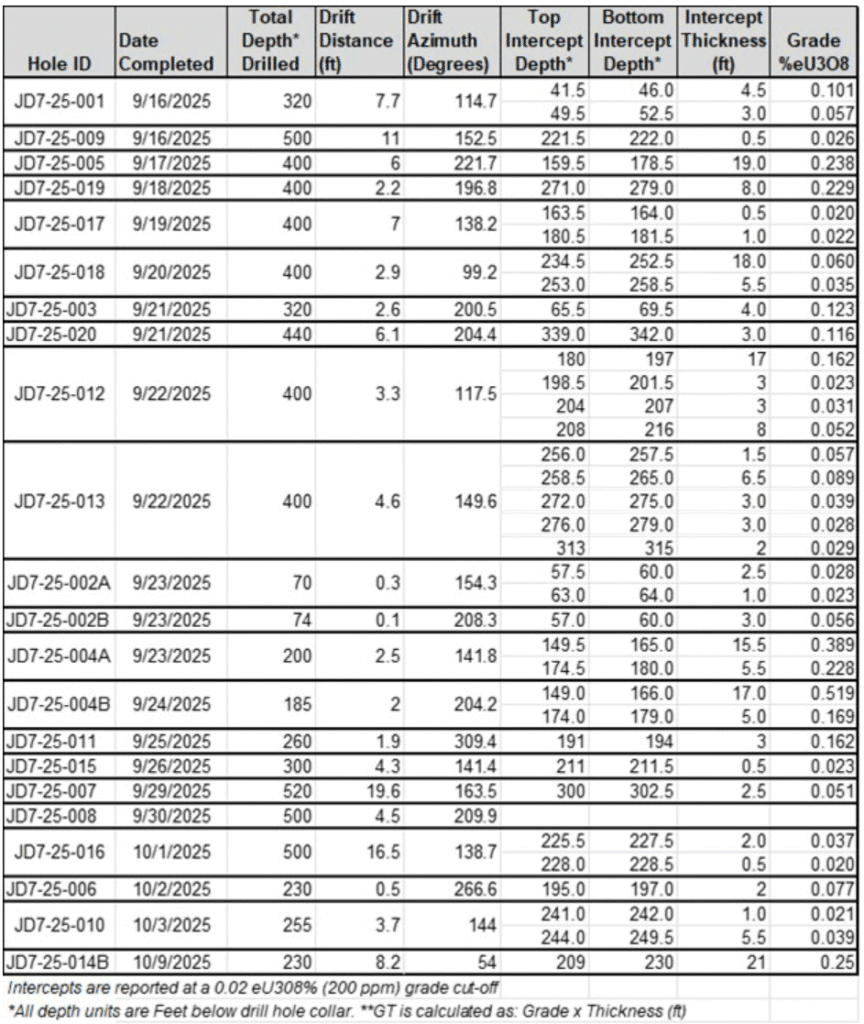- 19.0 ft grading an average of 2,380 ppm (0.238%) eU3O8 in Hole JD7-25-005, with a peak of 9,240 ppm (0.924%) eU3O8 at 170.0 ft;