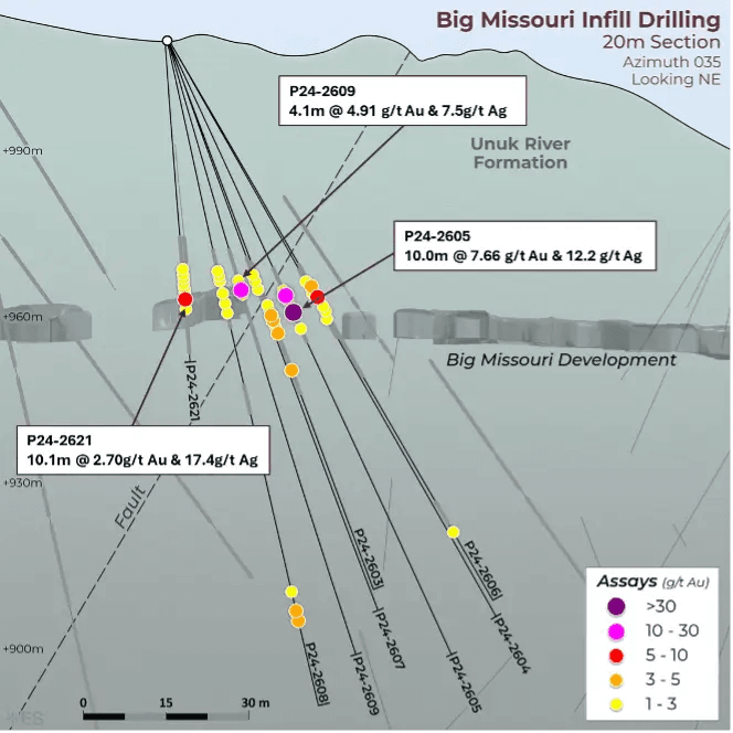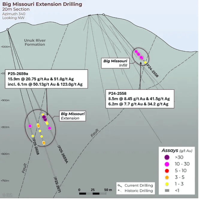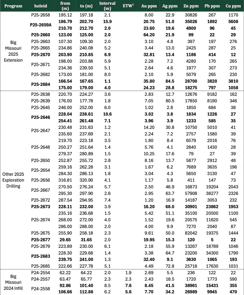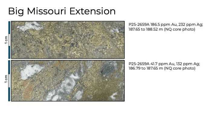 - High grade gold over significant widths in Big Missouri extension drilling, including 15.9m @ 20.75g/t Au & 51.0g/t Ag in hole P25-2695a and 6.9m @ 32.81g/t Au & 13.4g/t Ag in hole P25-2670.