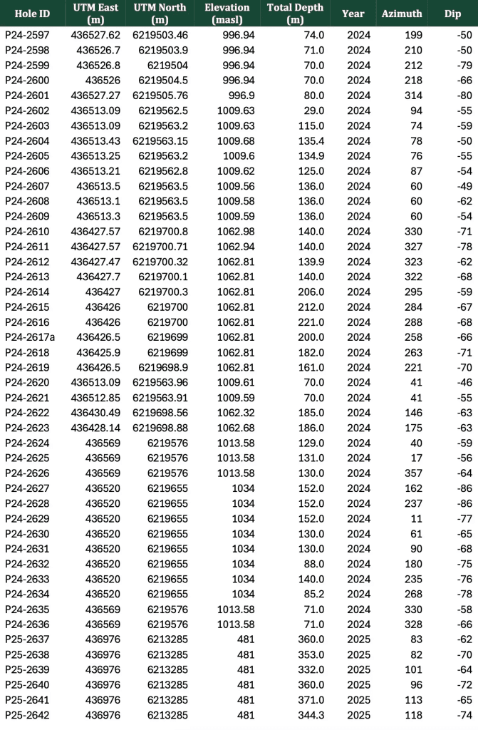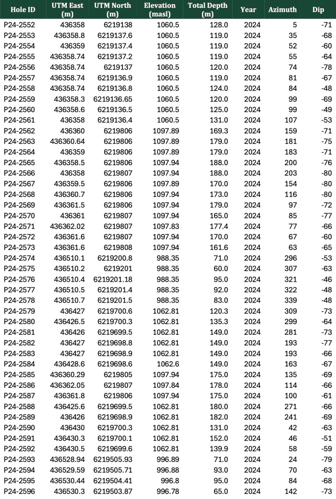 and 6.2m @ 7.70 g/t Au & 34.2 g/t Ag - P24-2605: 10.0m @ 7.66 g/t Au & 12.2 g/t Ag (incl. 4.8m @ 14.59g/t Au & 16.2g/t Ag)