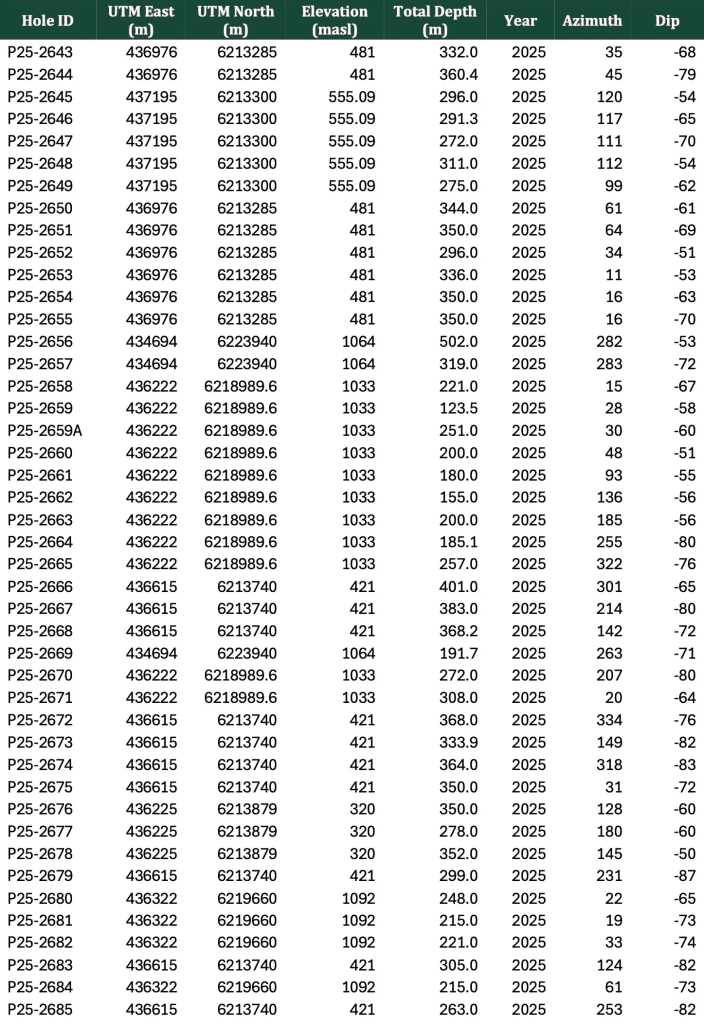 - P25-2670: 6.9m @ 32.81 g/t Au & 13.4g/t Ag (incl. 2.5m @ 88.24g/t Au & 20.1g/t Ag)