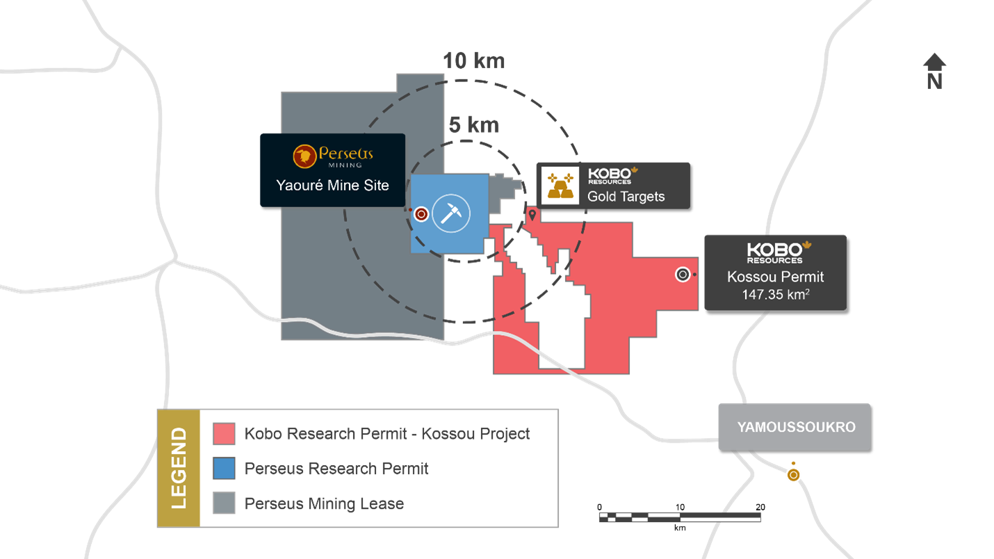 In the short term, Kobo’s main objective is the exploration and development of the Kossou Gold Project, which covers 146 square kilometers. Its Kossou Gold Project is located 22 kilometers to the northwest of the capital city of Yamoussoukro and 250 kilometers from the financial capital of Abidjan and is accessible primarily on paved roads or good secondary roads.