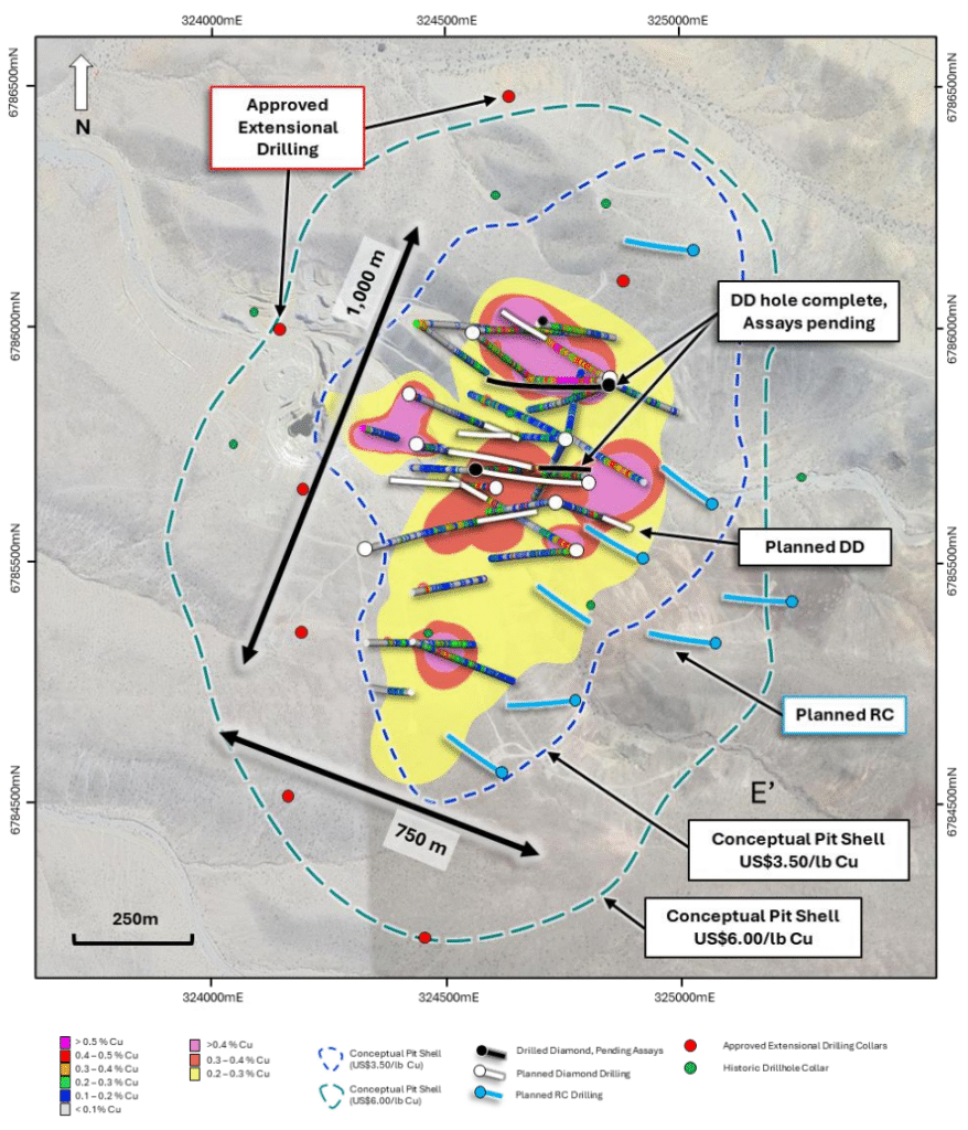 Figure 2. Plan view map of the La Verde porphyry system showing approved extensional collar locations (red points), planned (white traces) and completed DD drilling (black) compared with +0.2% copper (yellow), +0.3% copper (red), +0.4% copper (Magenta) mineralization interpolants from Phase one drilling. Conceptual open pit shells1 displayed for $US3.50/lb Cu (blue) and $US6.00/lb Cu (green) displayed as dashed lines. See announcement dated 25 September 2025 for JORC Table 1 additional technical information.