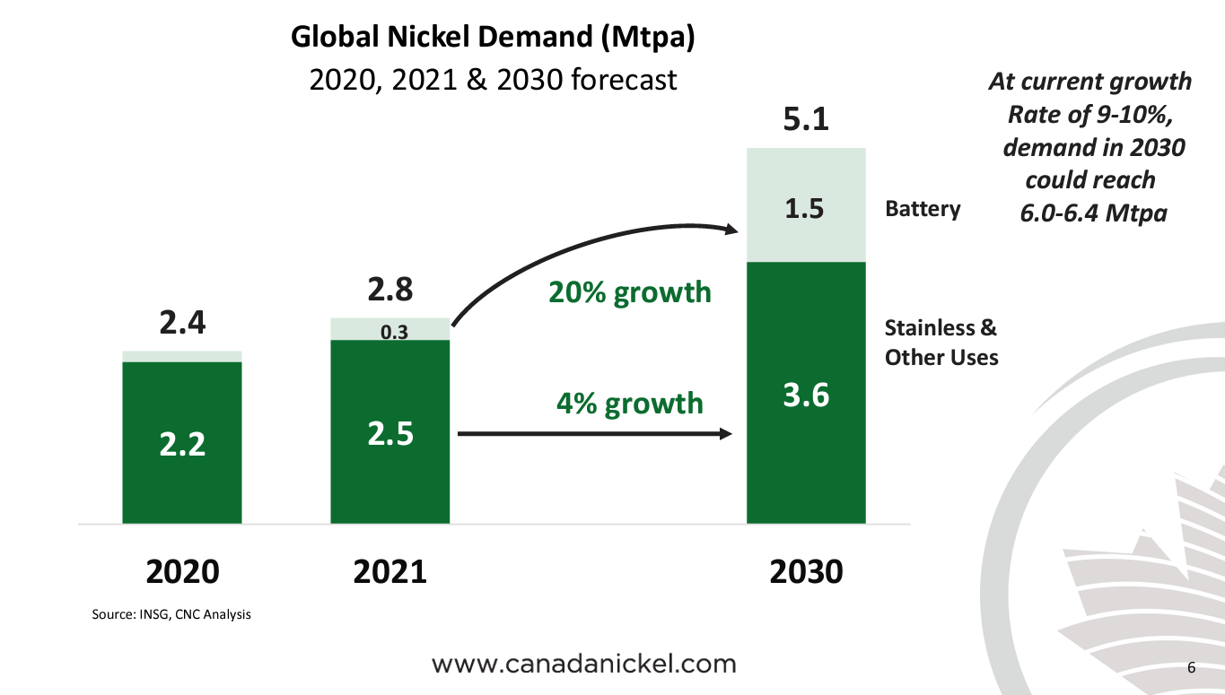 Based on industry forecasts and from Canada Nickel’s internal analysis, nickel demand is on track to hit 5.1 million metric tons per year, an 82% increase, or 7% annual growth over 9 years.