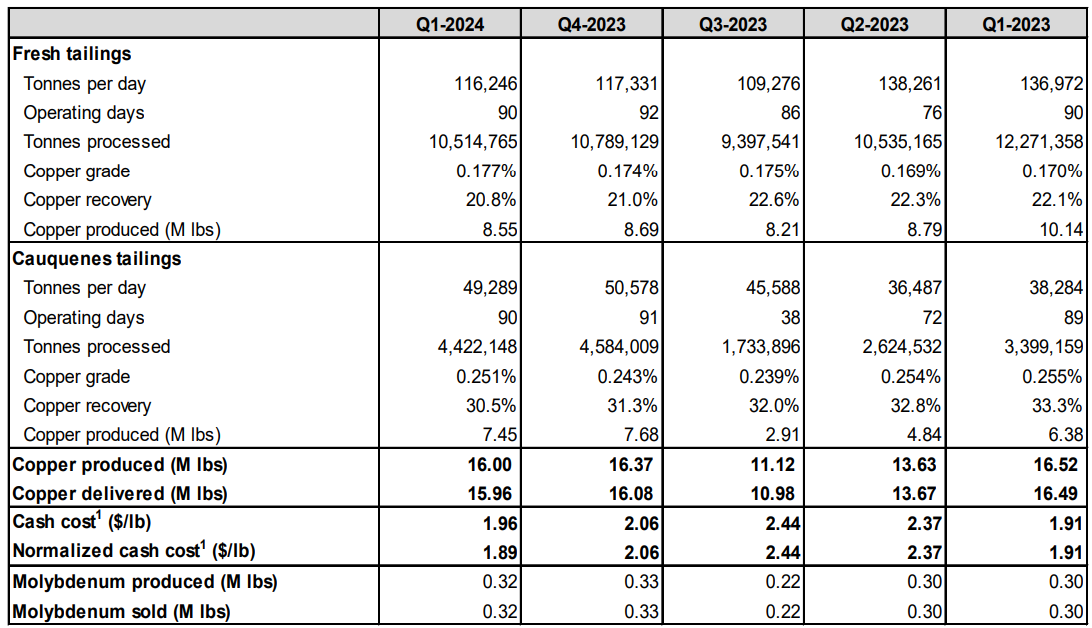 In Q1-2024, MVC produced 16.0 million pounds (“M lbs”) of copper, with 53% of production coming from fresh tailings. MVC’s plant availability was 97.7%.