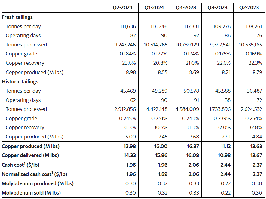 - Q2-2024 Copper Production of 14.0 million pounds, 2024 Guidance Maintained