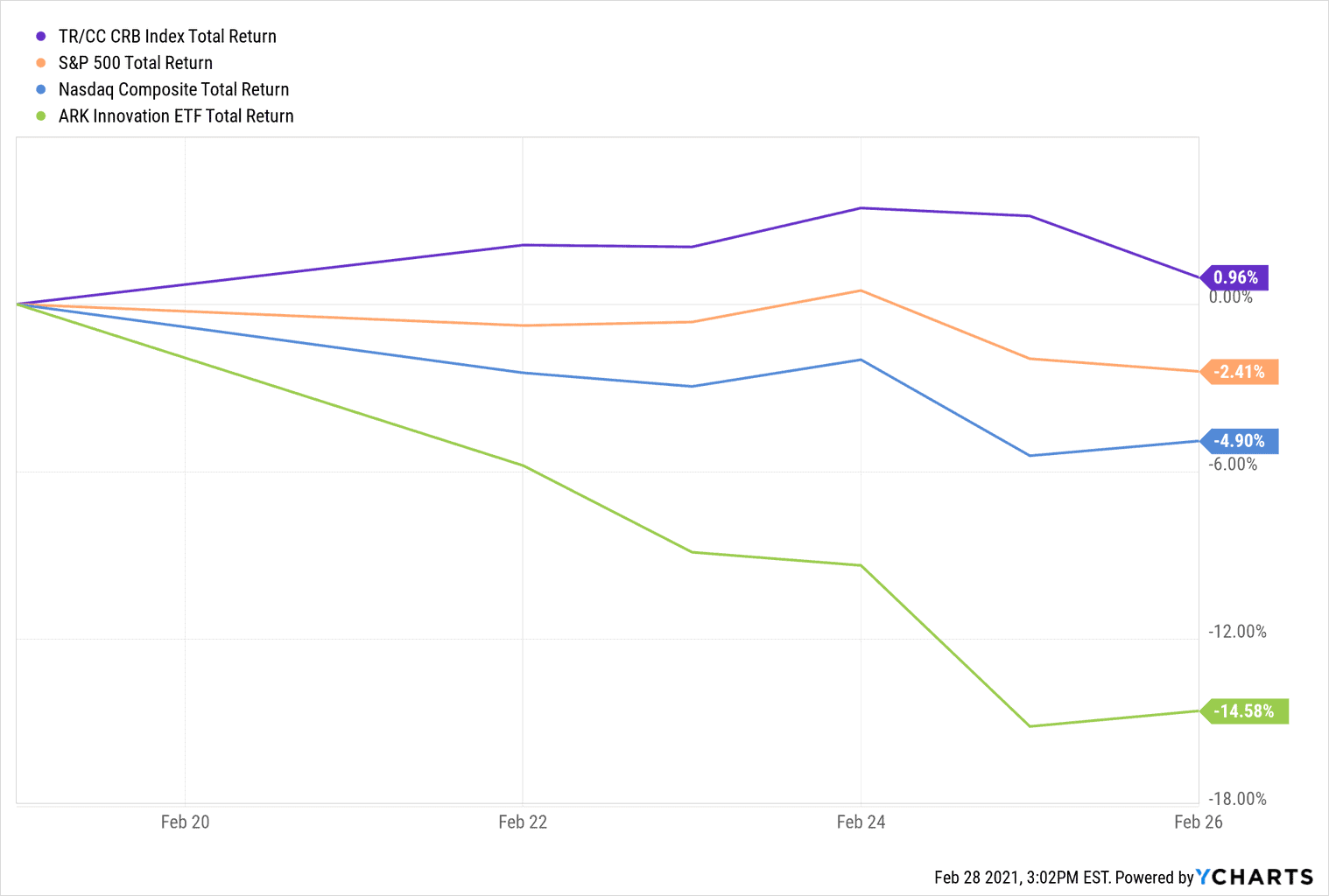 However during the volatile week the CRB Commodity Index was up 1%, while the tech heavy (and high valuation multiple) Ark Innovation ETF was down 15%.