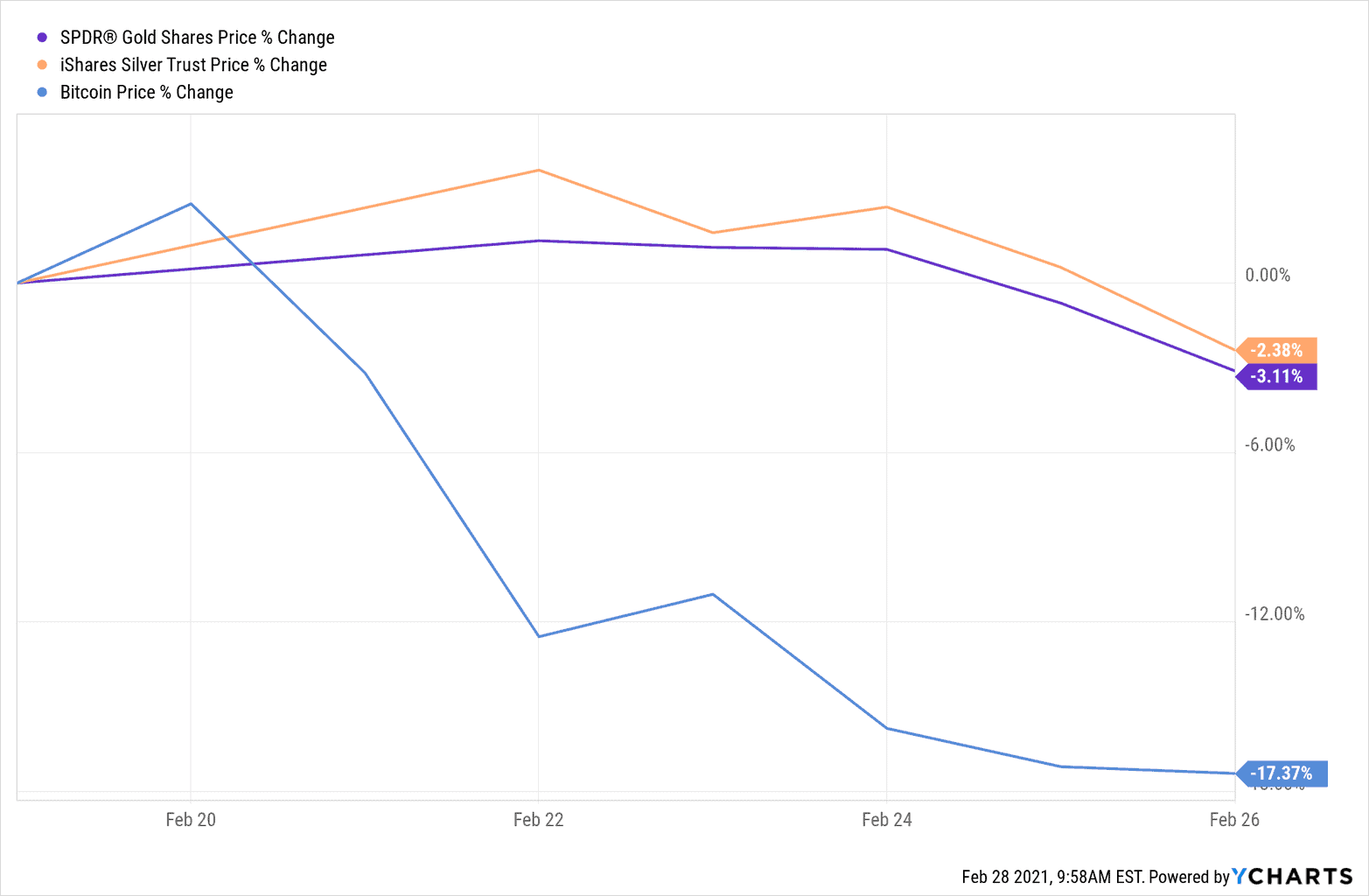 While gold and silver sold-off inline with the S&P500, Bitcoin was bludgeoned – down -17% last week. It highlights two key points for investors: 1. Bitcoin as an asset is still very young and carries significant associated volatility. 2. There’s a high tech market beta associated with Bitcoin, a high correlation with selloffs in high flying tech (Ark & Tesla).