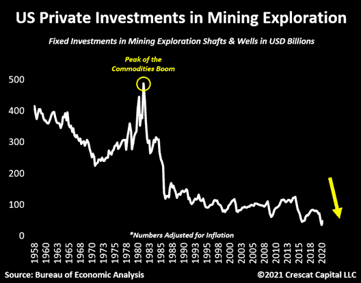 Tavi Costa from Crescat Capital highlighted on Twitter that US private investment in mining exploration is at the lowest level since the last peak of the commodity bubble in 1983.