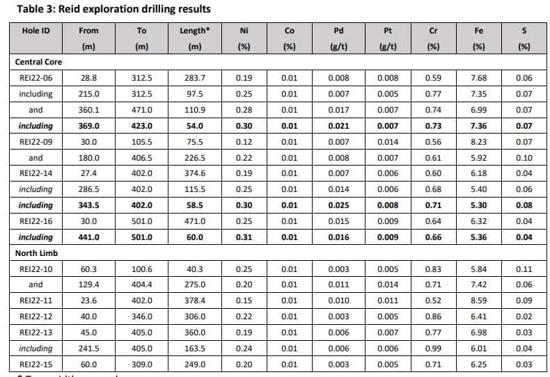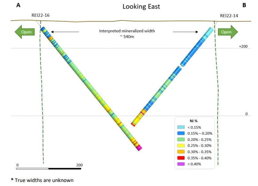 REI22-14 collared in peridotite and ended in higher grade mineralization. The hole averaged 0.20% nickel over 327.0 metres, including 0.30% nickel over 58.5 metres at the end of hole. REI22-16 collared in peridotite approximately 540 metres north of REI22-14. The hole also ended in higher grade mineralization and averaged 0.25% nickel over 471.0 metres, including 0.31% nickel over 60.0 metres at the end of hole (Table 3).
