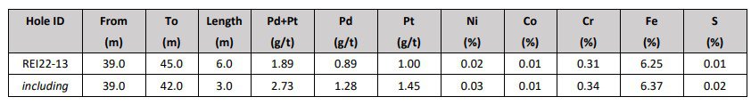 REI22-13 collared approximately 400 metres northwest of REI22-12 in a gabbro to pyroxenite to peridotite sequence. The hole ended in moderate to strongly serpentinized dunite. Peridotite-dunite averaged 0.19% nickel over 360.0 metres, including 0.24% nickel over 163.5 metres. At the top of the hole, a section of the pyroxenite averaged 1.89 g/t Pt+Pd over 6.0 metres (Table 4).