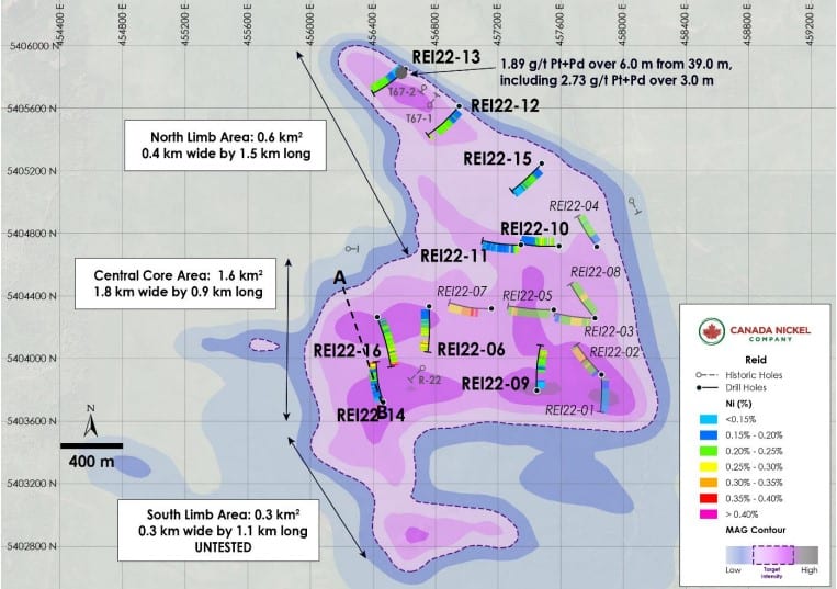 REI22-15 collared in dunite approximately 640 metres southeast of REI22-12 and ended in peridotite. The dunite averaged 0.20% nickel over 249.0 metres. With these encouraging results, Canada Nickel plans to resume drilling at Reid in 2023. The south limb of