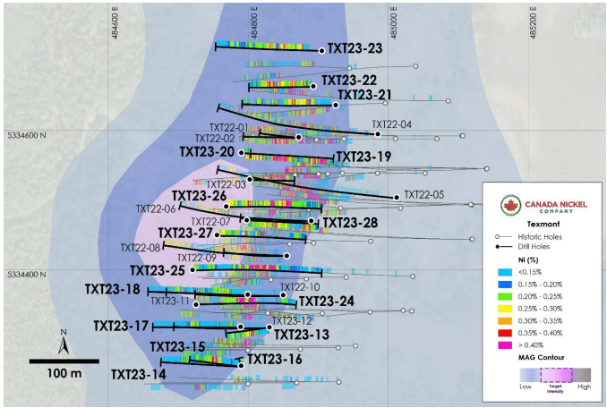 TXT23-23 was collared approximately 220 metres northeast of the shaft. The hole intersected 0.24% nickel over 181.9 metres, including 0.30% nickel over 37.5 metres.