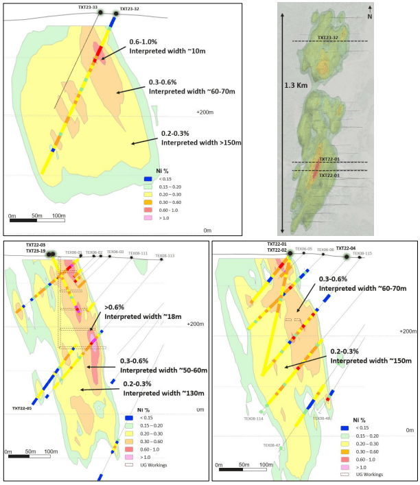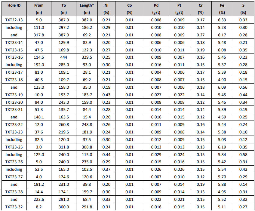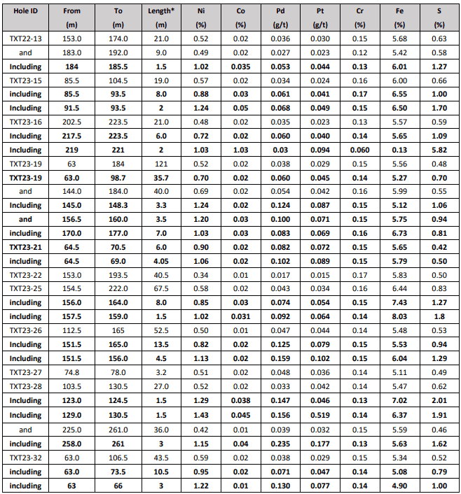 • Hole TEX23-26 intersected 3 metres of 1.47% nickel within 13.5 metres of 0.82%