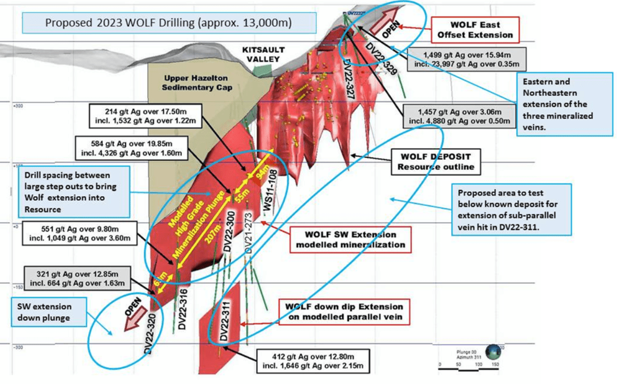 Drilling allocated to the Wolf Deposit expansion will focus on both infill drilling of the wide-spaced intercepts from 2022 to be included in an upcoming resource estimate, as well as further step out holes in both the southwest, north and east directions where high grade silver mineralization remains open.