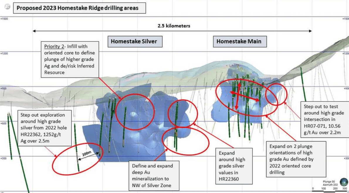 Drilling at Homestake Silver will prioritize step out holes where 2022 expansion drilling had success at the southern extent, with HR22-362, a 200 meter step out that intersected 1,252 g/t Ag, 0.81 g/t Au and 0.14% Cu over 2.50 meters, including 3,330 g/t Ag, 0.75 g/t Au and 0.38% Cu over 0.75m.