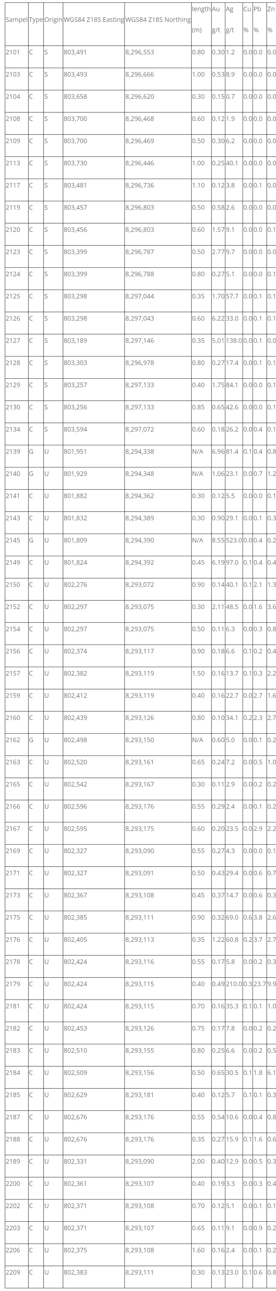 Among a total of 97 samples were sent for assays, 56 of which returned greater than 0.1 g/t gold (up to 8.55 g/t gold and 523 g/t silver) which are shown in Table 1.