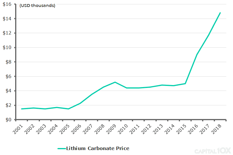 From 2008 to 2015, production of lithium, which, aside from batteries, is used mostly in glass and lubricants barely grew. Whereas, between 2015 and 2018 production doubled and prices tripled as EV sales took off.