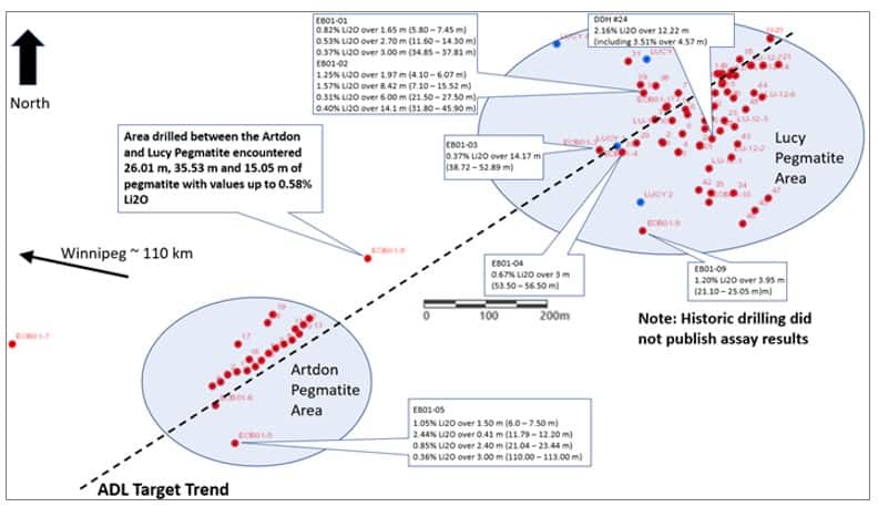 ADL Target Trend and historical drill hole collars based on information from the Manitoba government assessment files with highlighted lithium results from the 2001 Avalon Ventures drill program.