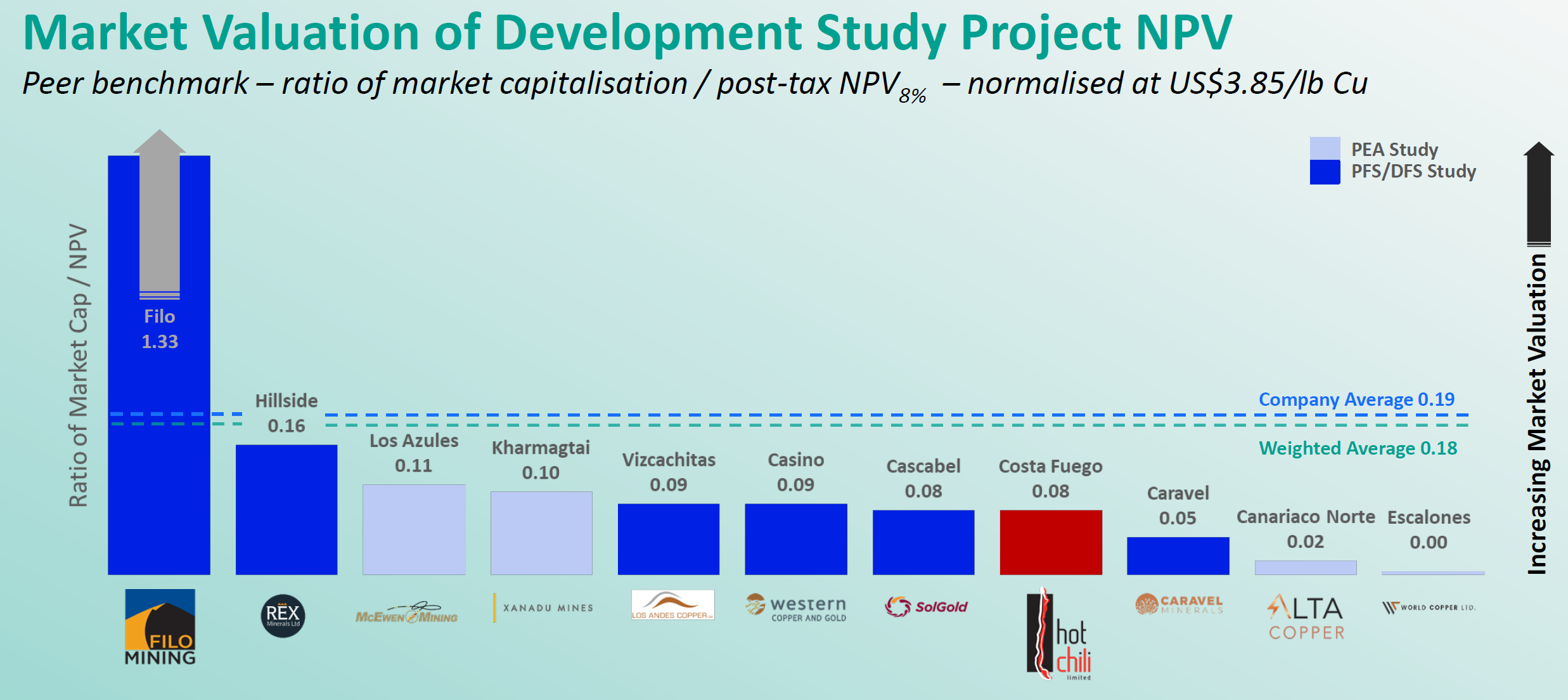 A preliminary feasibility study (PFS) and bankable feasibility study (BFS) will be out within 6 and 24 months respectively on top of exploration drilling that could really move the needle. Hot Chili is in the sweet spot to see a rerating of its 70% NPV discount regardless of what happens with copper prices now hovering near $4.50/lb.