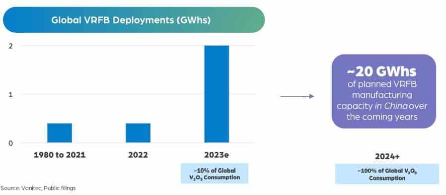 - China is building 2GW of vanadium redox flow batteries over the next 12 months, enough to absorb 10% of global vanadium supply. It also plans to install ~20GWh of vanadium battery manufacturing capacity over the coming years, which would increase global vanadium consumption by 100% once fully utilized.