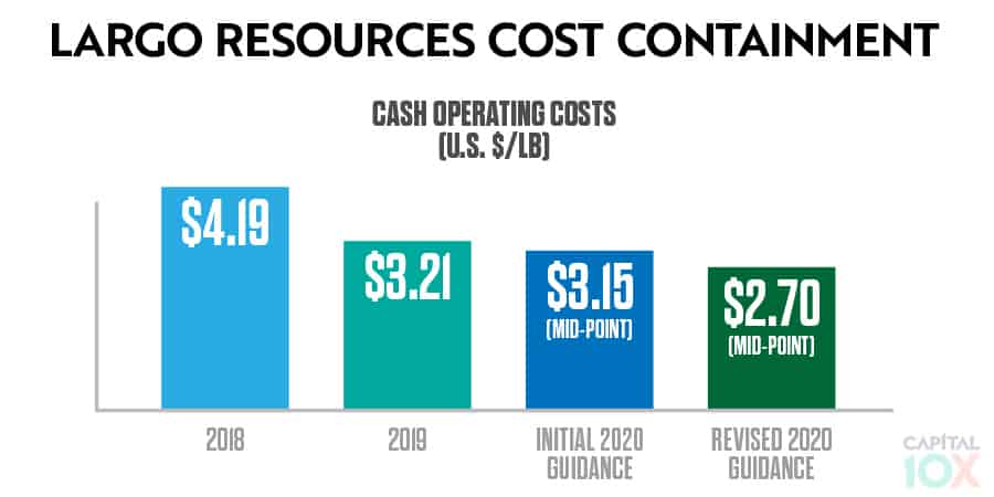 Cash operating cost excluding royalties guidance was lowered to US$2.60-$2.80/lb V2O5 from the previous range of US$3.05-$3.25/lb V2O5 – a reduction of 14%. Based on the current guidance mid-point it implies the company will have reduced cash operating costs by 35% since 2018.