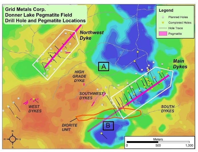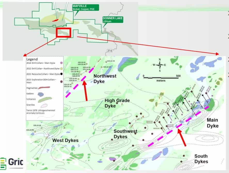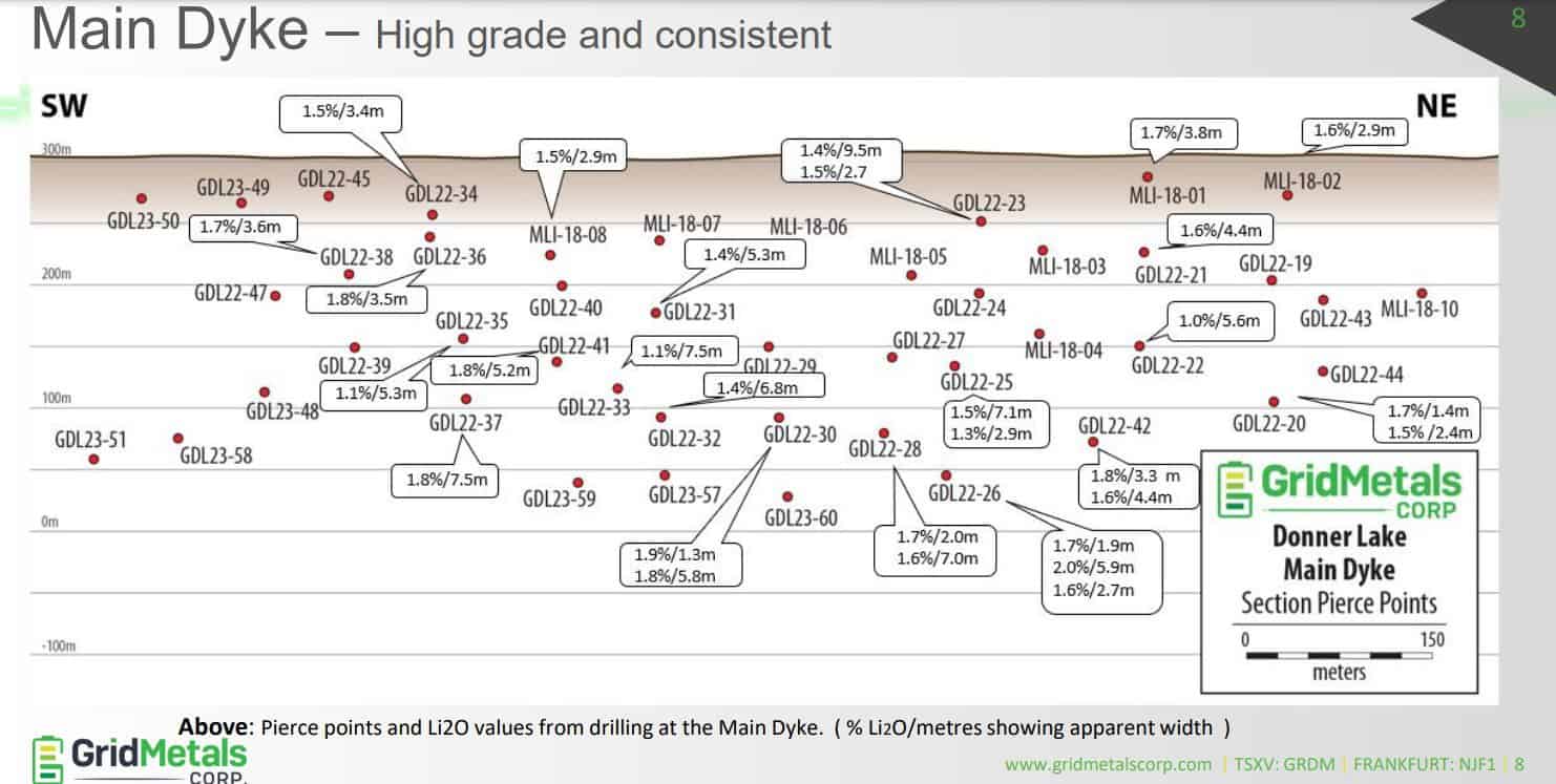 Grid’s Donner Lake lithium project has seen significant drilling in 2022-2023 and the project’s main dyke is showing signs of a significant and consistant lithium resource.