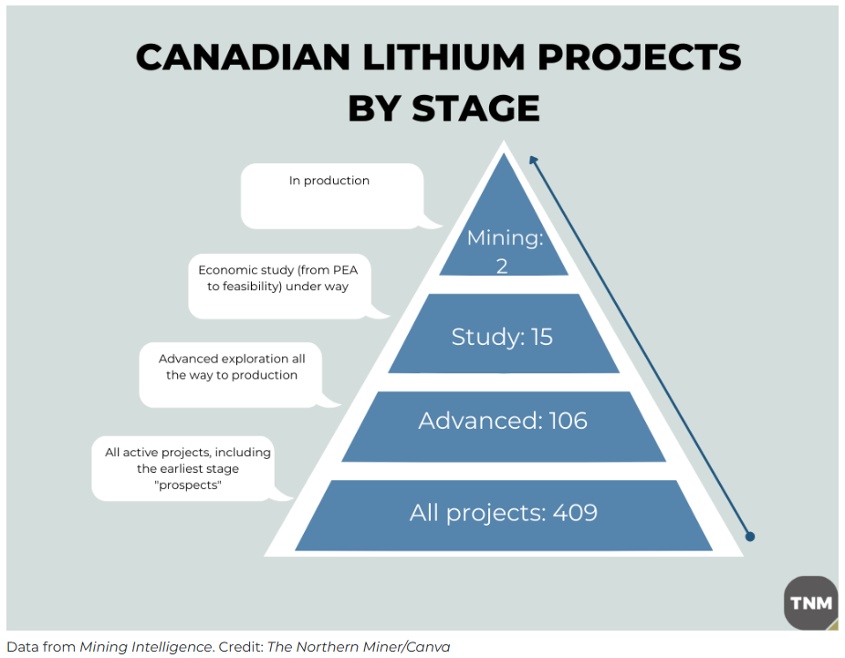 According to S&P Mining Intelligence, there are 409 active lithium projects in Canada, however only 17 of them are at the mining and feasability stage.
