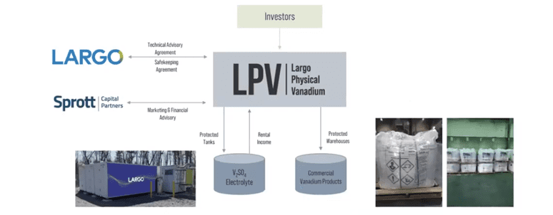 LPV facilitates the storage of the pure metal form of vanadium and vanadium electrolyte. With aqueous vanadium electrolyte there is no risk of theft or fire loss. Also, there’s no degradation of the vanadium when stored in batteries; the electrolyte can be converted back into vanadium pentoxide form as required, at Largo’s expense. So, before we get confused (I can see the posts and emails coming), let’s examine the relationship between the entities involved.