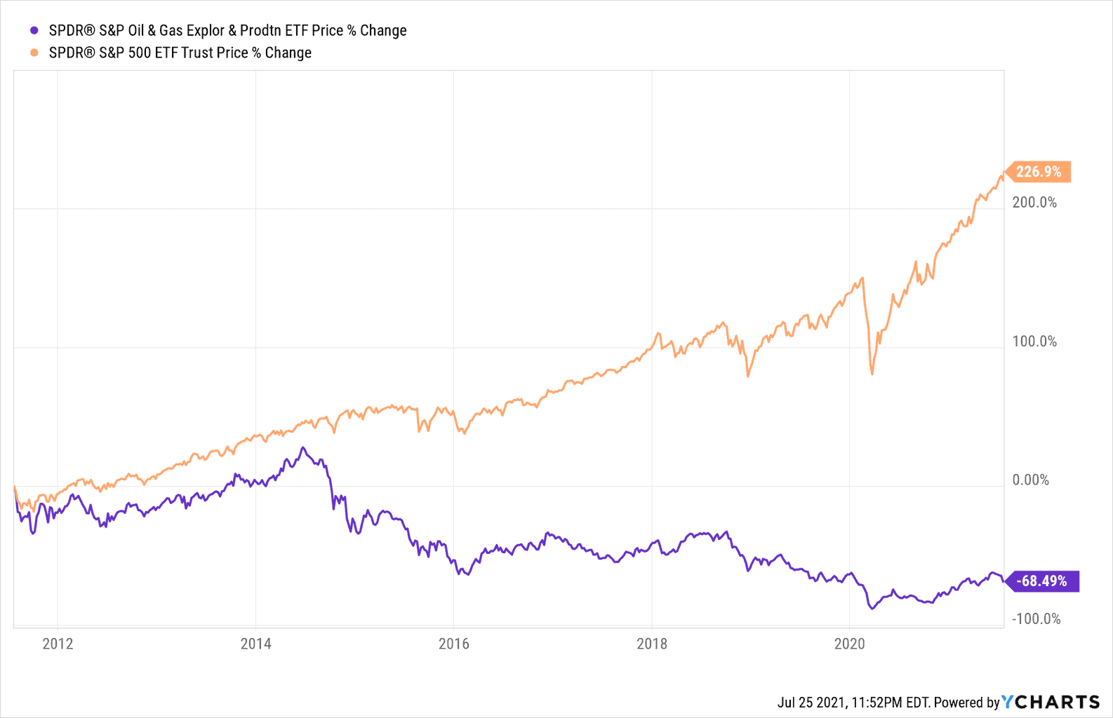 However, it’s worthwhile panning further back to see how much pain energy stocks have endured over the last decade. In this period the S&P 500 is up 226% while the S&P Oil & Gas Exploration Index is down -68%.