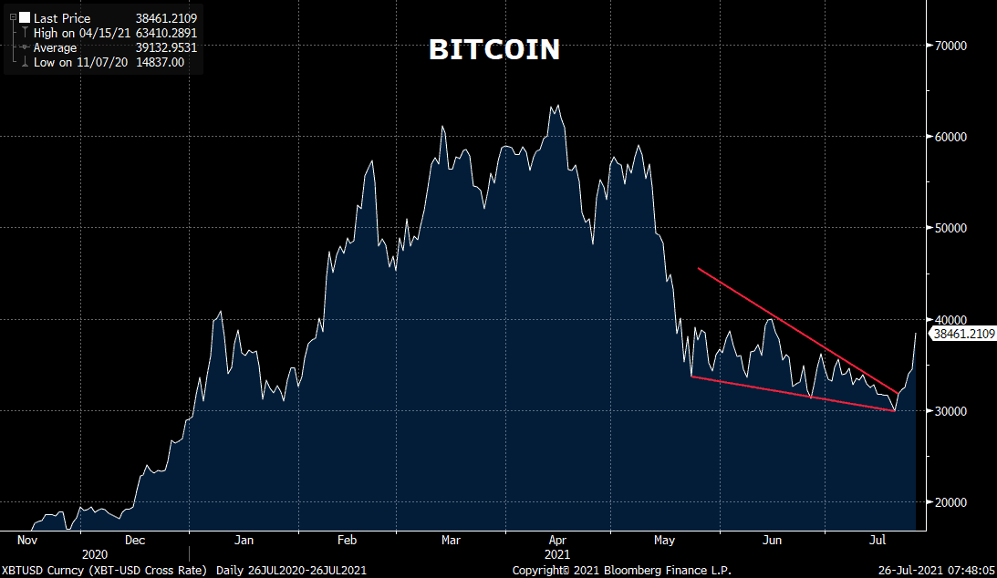 Late Sunday July 25th Bitcoin investors got a much needed green jolt, the cryptocurrency rose 12% to $38,472. This surge resolves a troubling grinding wedge lower over the last 2 months. A break over $40,000 would certainly give Bitcoin bulls renewed energy to test its previous all time high of $65,000.