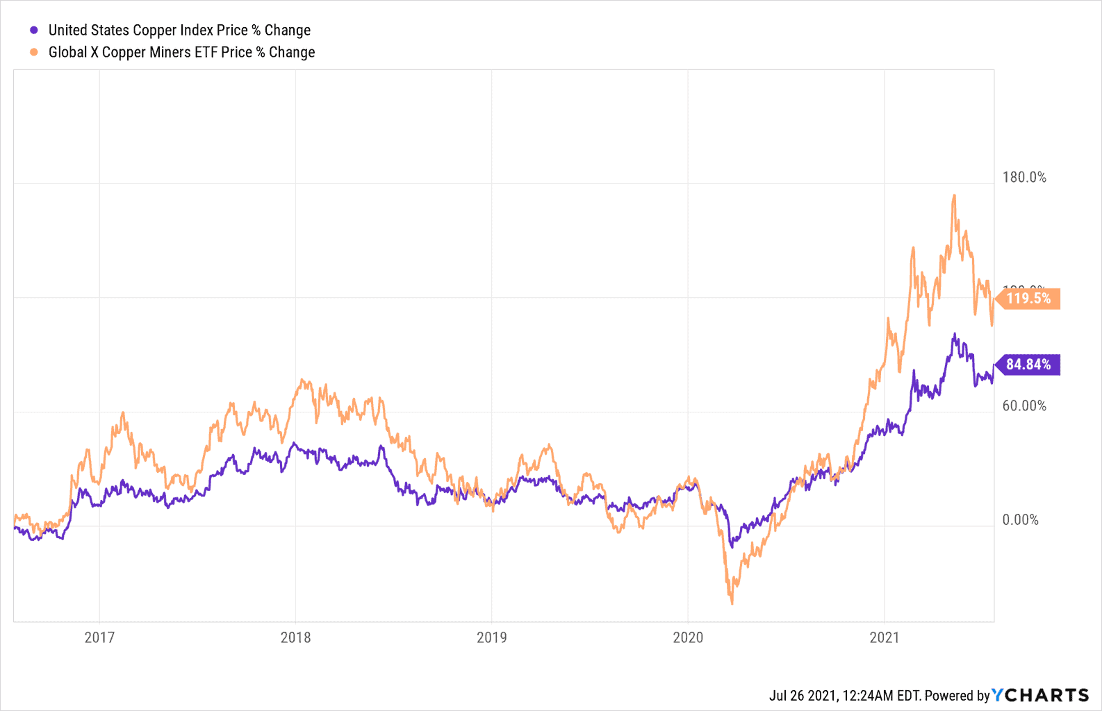 Looking back over the last 5 years copper mining equities have outperformed the metal copper; a healthy environment for the underlying equity investors.