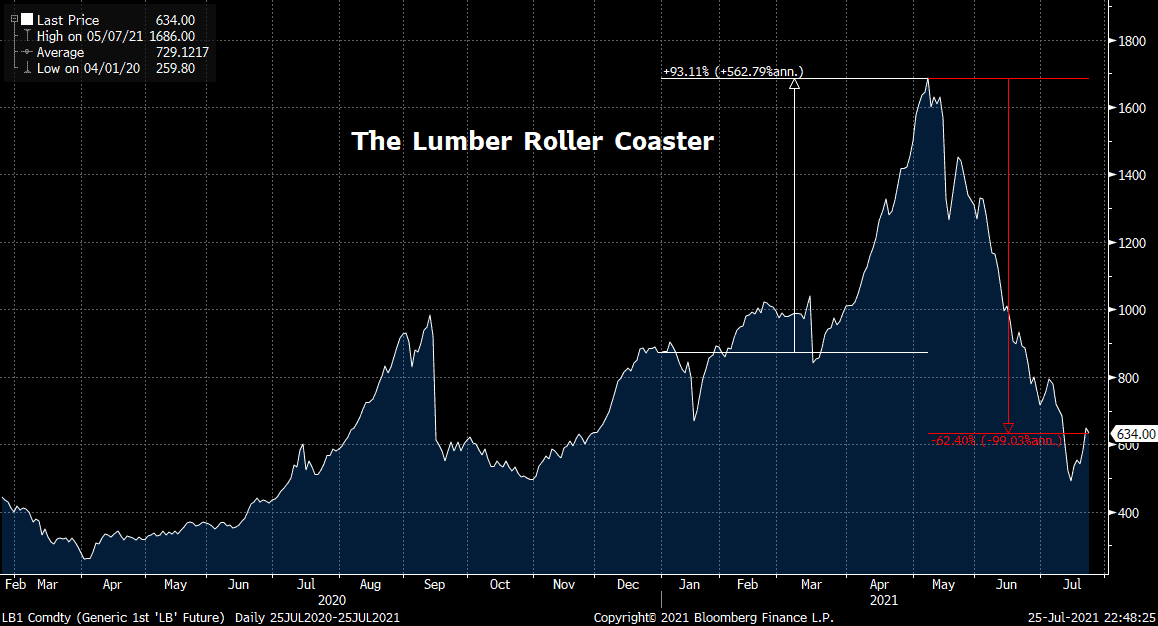 Lumber prices surged to record highs this year on the back of booming demand from homebuilders and renovators. The price surge was so big and sudden (spiking 93% by May), it became a symbol of what some economists feared: rampant inflation.