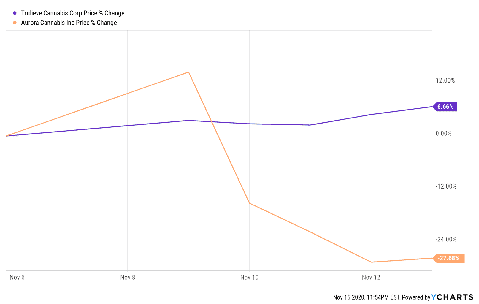 As we highlighted in last week’s Navigator, Aurora Cannabis (TSX:ACB) was the most bid up stock last week on the back of Biden’s victory. The stock rose a whopping +137%, a head scratcher to say the least given the company has zero business exposure to the U.S.