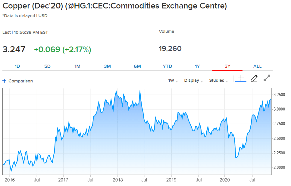 Late Sunday evening copper rose over 2%, surging to a 2-year high on the back of strong Chinese economic data. Industrial output (+6.9% in October) and fixed-asset investment (+1.8% for the first 10 months of 2020) both beat consensus expectations.
