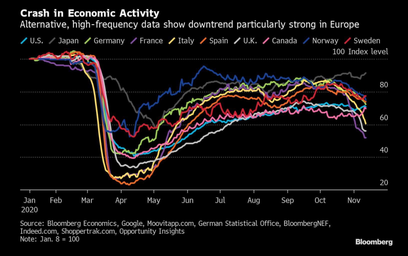 Economies will continue to be hampered through the fall and winter as business shut downs reemerge. The graph below highlights the crash in economic activity throughout Europe.