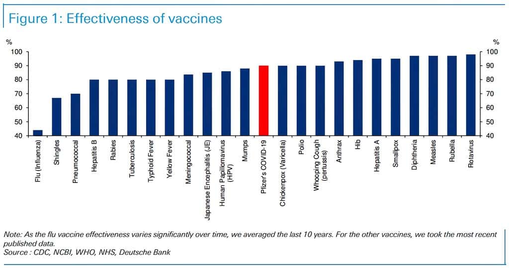 The 90% effective rate for Pfizer’s coronavirus vaccine is significant when compared to other successful vaccines like polio and chickenpox. The flu shot in comparison is only 45% effective.