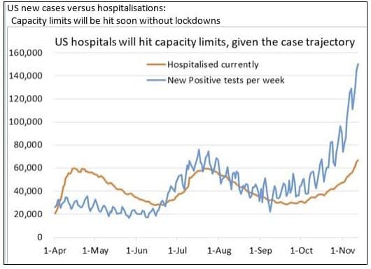 The situation in the U.S. is very acute, COVID-19 hospitalizations are above the previous April peak, while new positives tests per week have gone parabolic at over 150K.