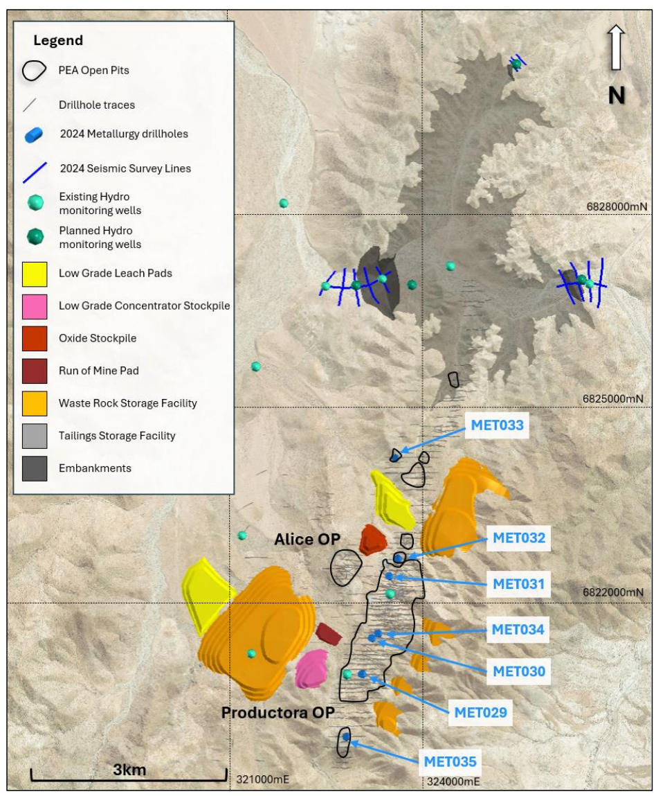 Aerial photo of Productora indicating the location of completed seismic survey and collars of hydrological drillholes relative to the planned mine infrastructure. Location of metallurgical drillholes completed in Q2 are displayed as blue traces