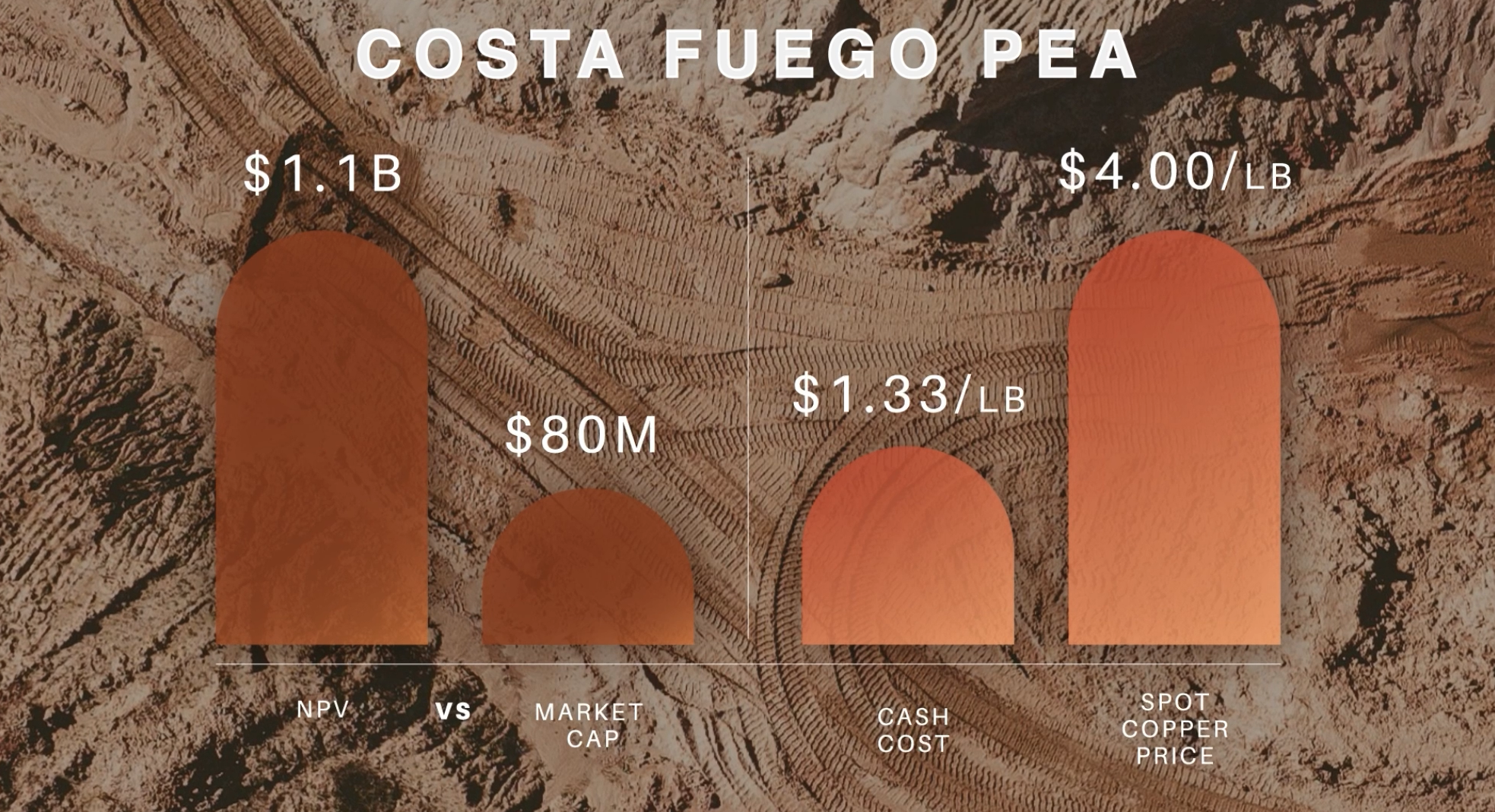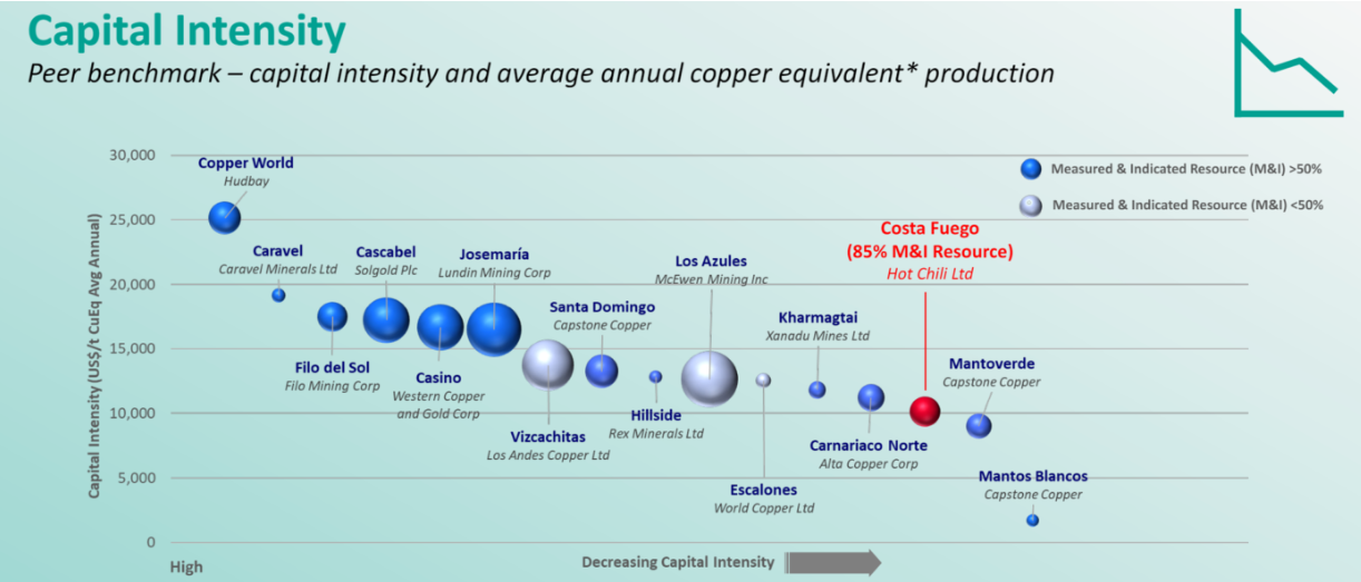 Hot Chili is one of the best positioned copper juniors in the world. Costa Fuego has copper grades in line with other projects moving forward, attractive economics, even excluding additional exploration success, and unique water access that will both generate non-copper revenue and make Hot Chili a low cost producer in the region.