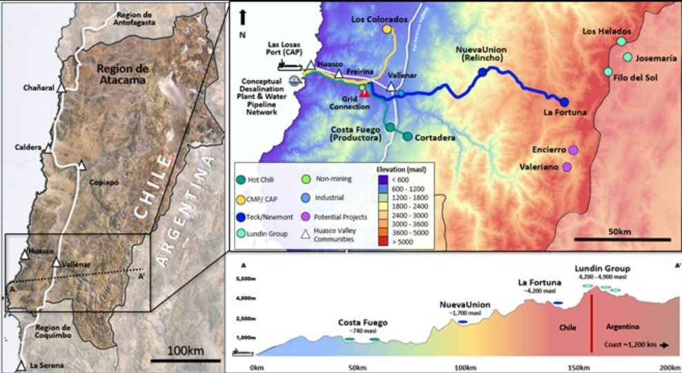 Location of a conceptual multi-user, desalination water network in relation to infrastructure and potential customers in the Huasco valley region of the southern Atacama, Chile
