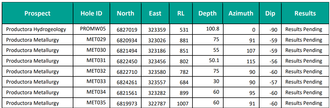 Twenty-nine Line-kilometres (Lkm) of MIMDAS1 was completed from May to June across the Productora (12Lkm) and Cortadera (17Lkm) projects. This deep penetrating electrical geophysical technique detects the chargeability, resistivity, and conductivity properties of underlying rocks. The results of the surveys are currently under review, in combination with geological mapping, drillhole logging and existing geochemical datasets.