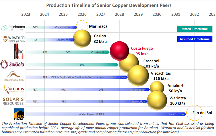 Hot Chili’s Costa Fuego is valued at a fraction of Filo’s project even while on schedule to be one of only three large copper projects to begin producing between 2024 and 2029. Years ahead of Filo.