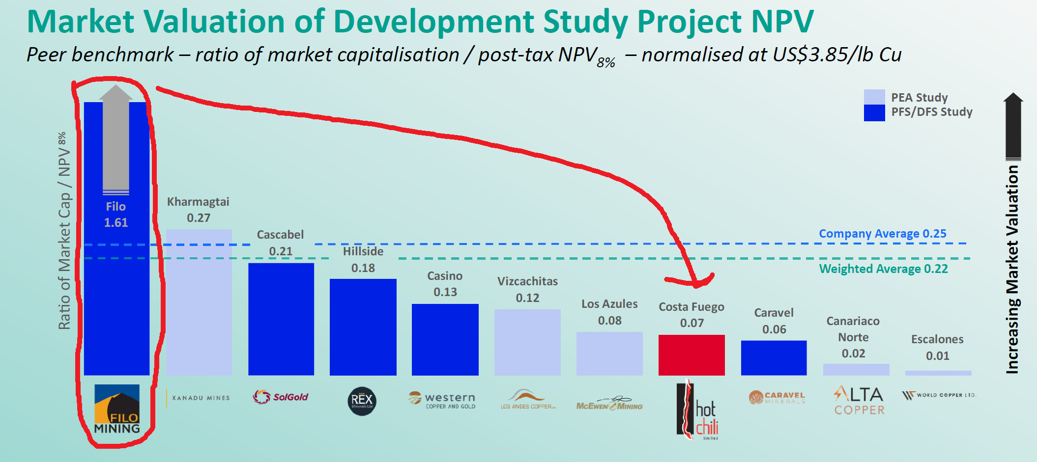 Filo was taken out for 2.3x NAV while Hot Chili trades at a frankly ridiculous 0.07x NAV with a project of similar value and size.