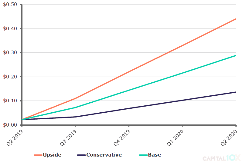 The graph below provides an overview of how we believe these cash flows will be distributed over the next 12 months. The three cases are based on the guided cash flows, with the Upside representing $55M, the conservative representing $17M, and the base case sitting between the two.