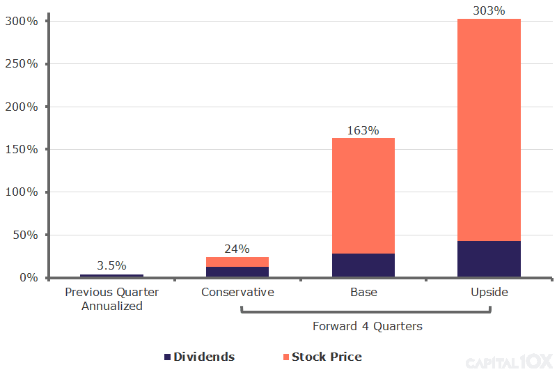 The distributions alone will provide a significant return on investment, reaching 43% returns for the upside case over the 12-months. However, we expect the stock price to climb as the distributions are increased.